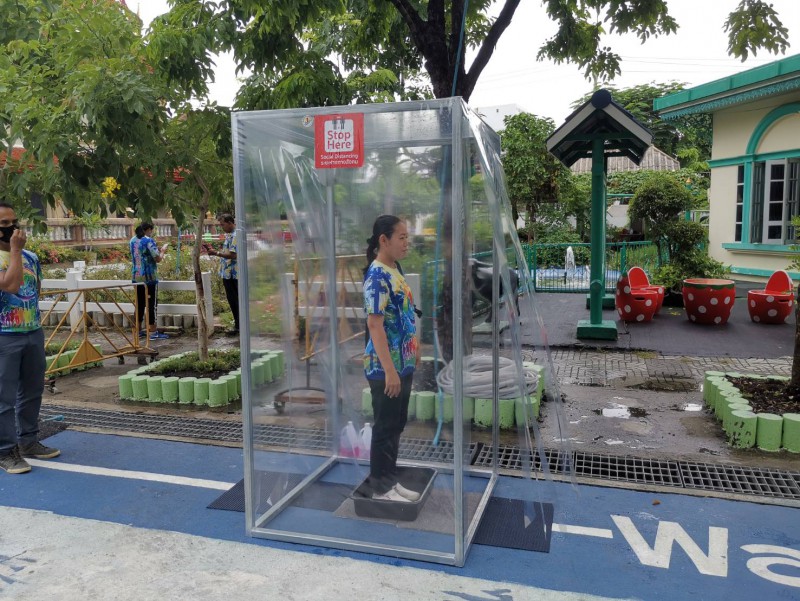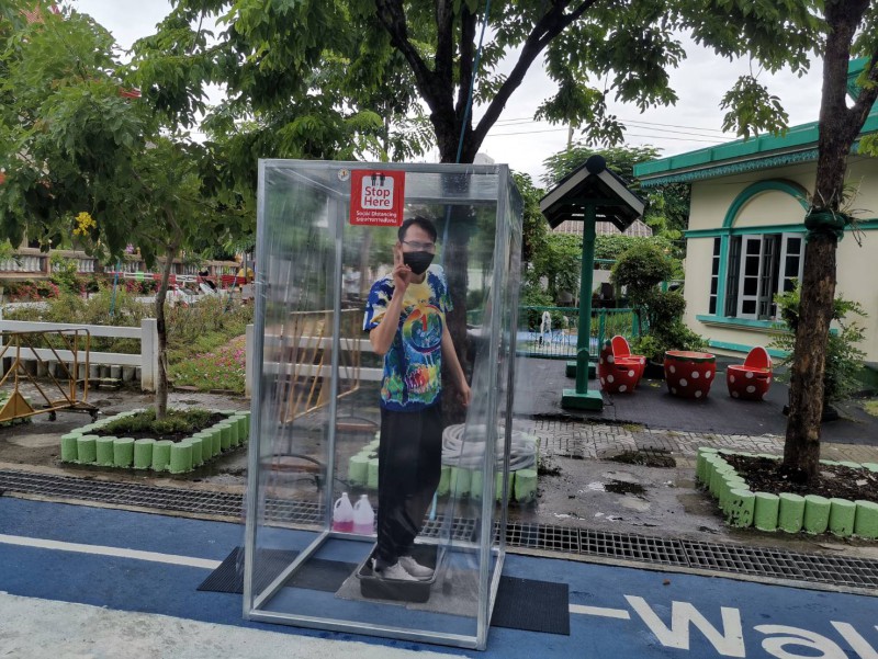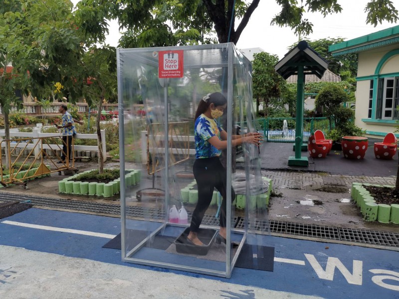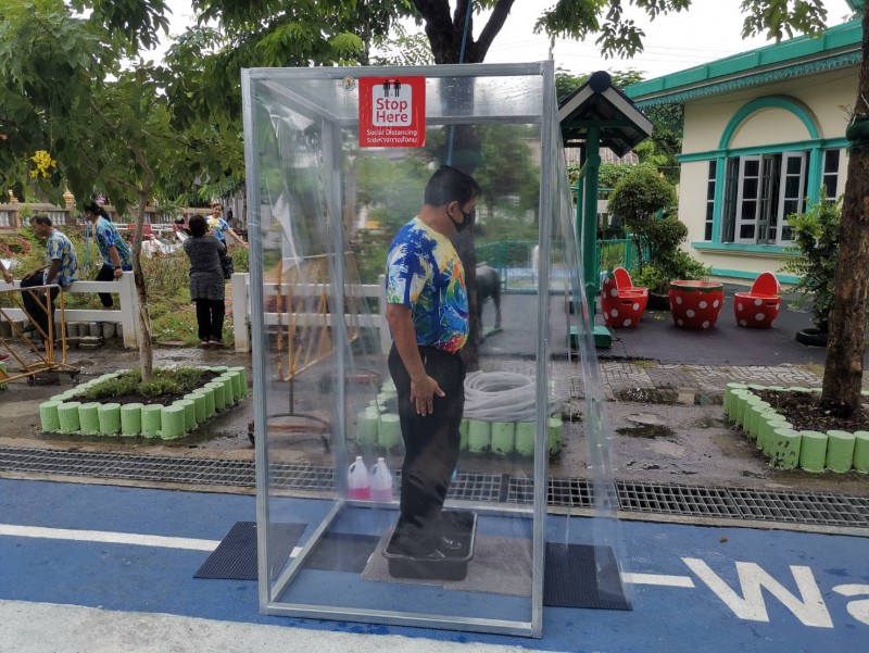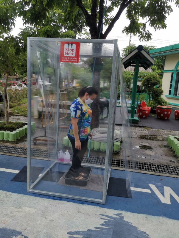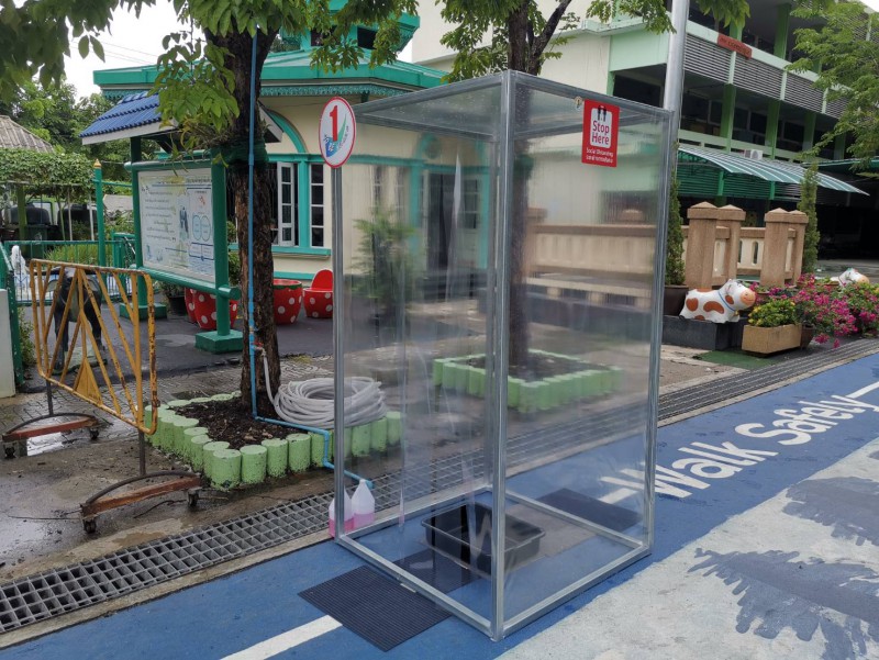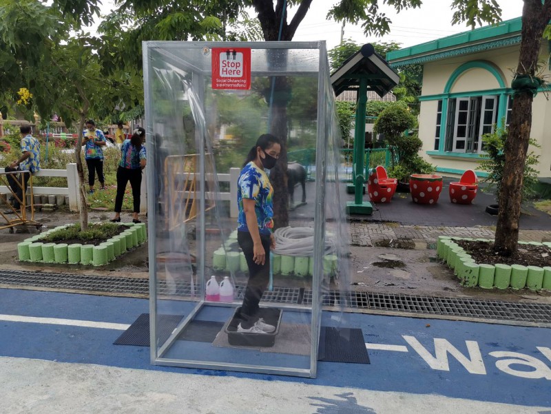 โรงเรียนวัดยายร่มจัดเตรียมตู้ทำความสะอาดรองเท้า และฉีดพ่นน้ำยาฆ่าเชื้ิอป้องกันโควิด-19