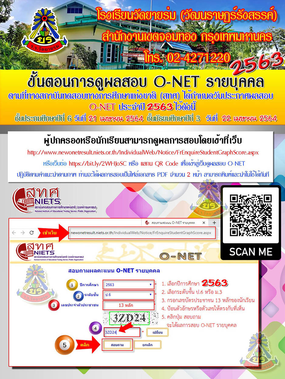 การดูผลการสอบ ONET รายบุคคลสำหรับนักเรียนและผู้ปกครอง สามารถเข้าได้ตาม QR Code หรือเว็บ