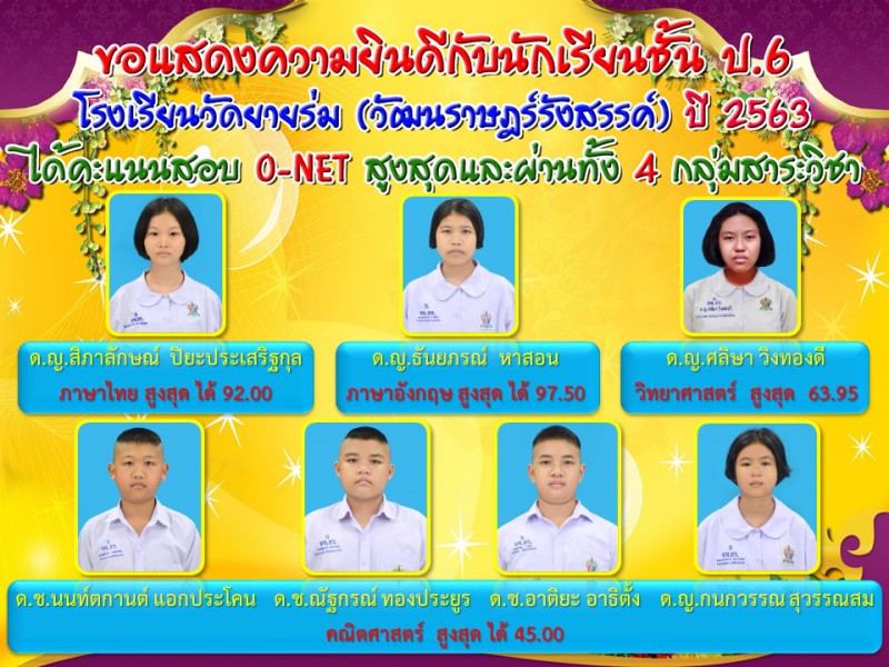 แสดงความยินดีกับนักเรียนชั้น ป.6 สอบ O-NET ได้คะแนนสูงสุดและผ่านทั้ง 4 รายวิชา