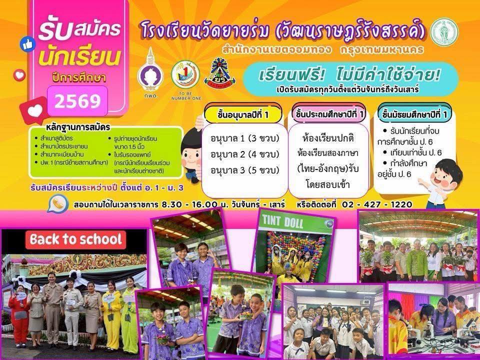 โรงเรียนวัดยายร่ม (วัฒนราษฎร์รังสรรค์) เปิดรับสมัครนักเรียนประจำปีการศึกษา 2568 ตั้งแต่ บัดนี้ เป็นต้นไป โทร. 02-4271220