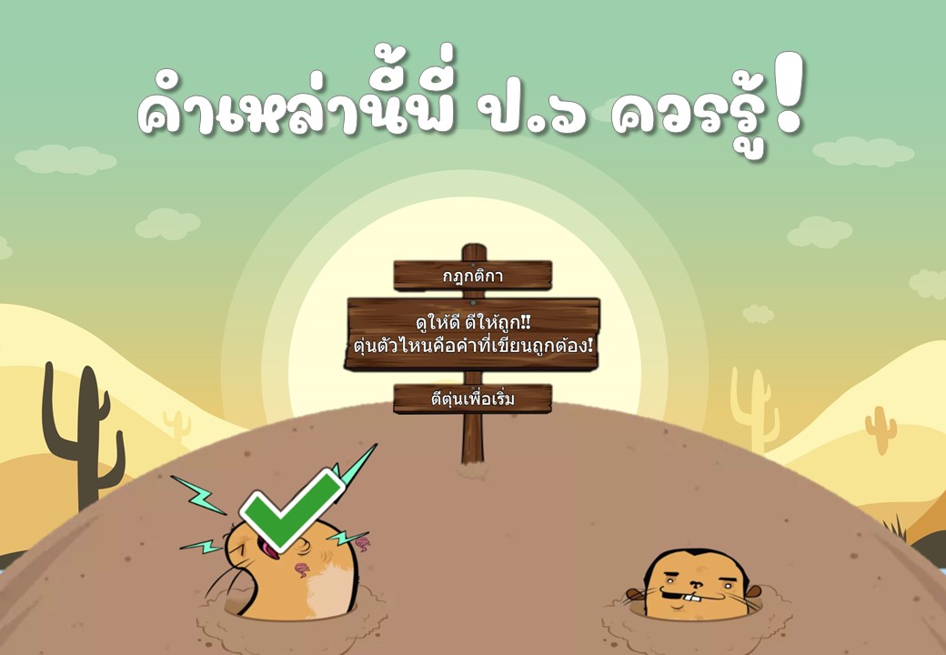 ฉะนั้นหากเด็ก ๆ ไม่มั่นใจคำศัพท์ใดก็ควรไปศึกษาค้นคว้าจากแหล่งเรียนรู้อย่างพจนานุกรมหรือเว็บไซต์ความรู้ที่น่าเชื่อถือต่าง ๆ จดจำ และนำไปประยุกต์ใช้ให้เคยชินกับความถูกต้อง... วันนี้จึงจัดแหล่งเรียนรู้ให้เด็ก ๆ ได้เรียนรู้คำศัพท์ที่เขียนสะกดถูกต้องผ่านการเล่นเกมตีตัวตุ่น! ซึ่งมีทั้งหมด ๖ ชุด